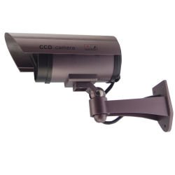 Now you can deter robbery and theft and vandalism without the high cost of a real security camera. When placed in your home or business even the most sophisticated criminals will think the premise is guarded by a high-tech surveillance system and go in search of an easier target. In fact this is an actual surveillance camera that has been modified into a dummy or fake security camera. This unit does contain a flashing light. The camera features authentic video cable and a fully adjustable plastic mounting bracket that will let you install the camera quickly and easily using the included stainless steel screws. The dimensions (including the rain shield and bracket) are 10 inches x 6 inches x 7 inches. The camera requires 2 AA batteries that are not included. A CCTV window sticker is included.