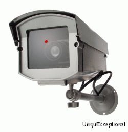 Now you can deter robbery, theft, and vandalism without the high cost of a real outdoor security camera. When placed outside your home or business, even the most sophisticated criminals will think the premises is guarded by a high-tech surveillance system and go in search of an easier target. In fact, this is an actual surveillance camera in outdoor housing that has been modified into a "dummy" or fake security camera. This unit is the same has our model DCOH which does not contain a flashing light. We have added a flashing LED light to this model because many of our customers wanted to be sure that the camera could be seen at night. Great security for parking lots or near the front door of a home, store, or business. Features authentic video cable, weather proof aluminum housing, and fully adjustable metal mounting bracket. Installs quickly and easily using the included stainless steel screws. Measures 12" long (rain shield extends 2 more inches) x 4" wide x 4 1/2" tall (excluding mounting bracket). Operates on 2 "AA" batteries (not included).